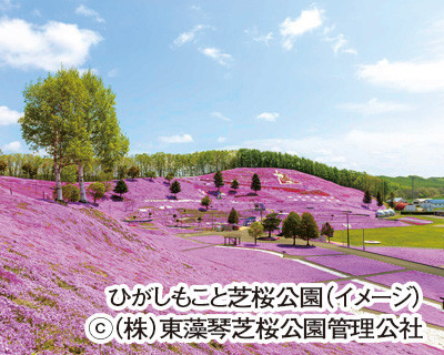 ●ひがしもこと芝桜公園は、10ヘクタールの広さを誇る公園は、見頃時期には、丘一面がピンクに染まり、一面に敷き詰められたピンクのグラデーションは圧巻です。